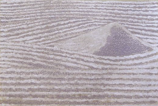 白砂をしきつめただけの庭、砂に上掃かれたゆるやかな線條と、盛り砂によるわずかな変化。