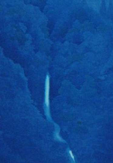 北アルプス奥穂高の雄大な山容。画面全体が、東山ブルーと呼ばれる荘厳たる青一色で覆われています。今まさに夕闇がしのびくるという一瞬その夕闇の中に一本の滝が光るように流れ、その白さがひと際山の静寂を際立たせています。