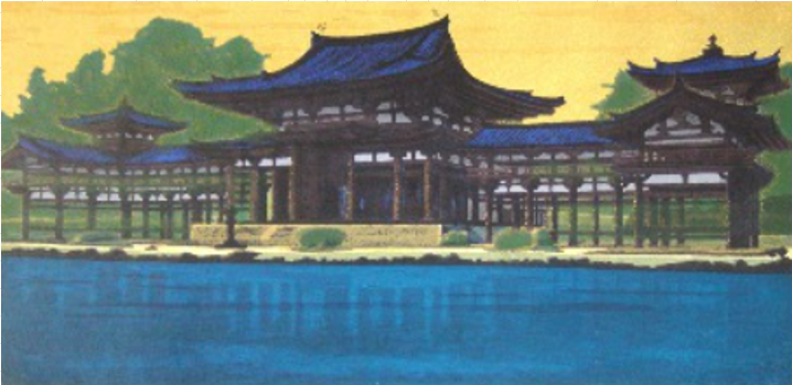 池の中島に建てられていることで、あたかも極楽の宝池に浮かぶ宮殿のようにその美しい姿を水面に映しています。「仏教伝来」を生涯のテーマとして描き続ける平山郁夫の代表的な作品の一つです。