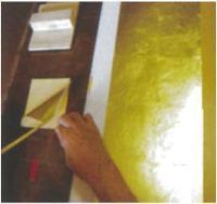 本作で使用されている純金箔(金地)は京都で長く培ってきた金箔貼りの伝統技術を基に版画用紙に適する様に新しい技術をくわえ京都の職人が1枚1枚手貼りしたものです。職人の手で1万分の1mmほどの厚さに地金を均一に叩き延し作られ、竹のピンセットを使い、空気の流れのない部屋の中で息を止め1枚1枚貼込んでおります。本作には1点につき40余枚の金箔が使われ、手張りの風合いで1点1点微妙な違いを見せています。