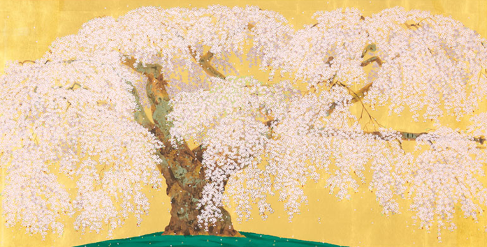 山梨県北斗市小淵沢町にある「神田の大糸櫻」は樹齢約400年のエドヒガンザクラで、県内でも稀なしだれ桜の巨木で、県の天然記念物に指定されrています。この威風堂々とした「神田の大糸櫻」を版画作品として再現いたしました。今回も純金箔手貼という伝統技術を用い、30版30色という手間をかけ完成いたしました。